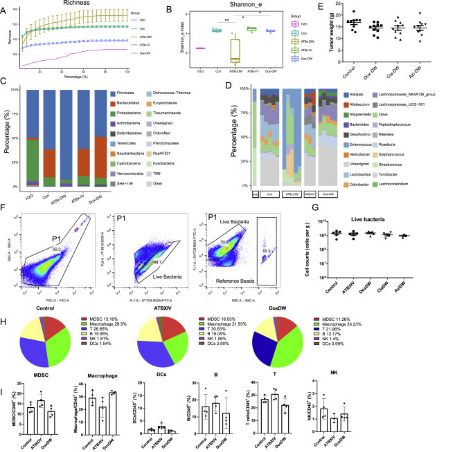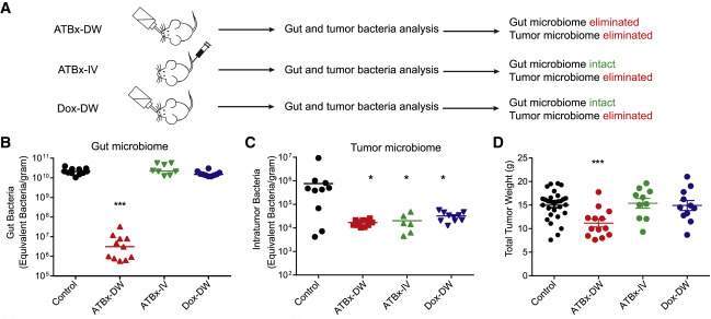 清除腫瘤內(nèi)的微生物會阻礙腫瘤的轉(zhuǎn)移,但不會阻礙原發(fā)腫瘤的生長通過測試不同的抗生素組合和給藥途徑來選擇性地消除腫瘤駐留或腸道微生物群(圖3A)。研究發(fā)現(xiàn)使用雞尾酒抗生素(ATBx),通過飲用水(DW)可以有效清除腸道和腫瘤微生物菌群。當ATBx經(jīng)尾靜脈靜脈注射時,腫瘤菌群被清除,而腸道菌群保持完整(圖3B和3C)。通過DW給藥穿透細胞膜的抗生素多西環(huán)素具有與ATBx-IV相似的效果(圖3B和3C)。最重要的是,ATBx-IV和Dox-DW處理在腸道活菌數(shù)量、腸道微生物群譜和腫瘤免疫譜方面與對照組保持相當(圖S3A S3D和S3F S3I)。結(jié)果發(fā)現(xiàn)ATBx-DW能有效地減緩自發(fā)MMTV-PyMT BTs的腫瘤生長(總腫瘤重量為15±對照組為0.5g,而ATBx-DW為11±0.8g),而單獨用ATBx-IV或Dox-DW消除腫瘤微生物群并不影響腫瘤總重量(圖3D)。這表明腸道菌群在腫瘤生長中起著重要作用,而腫瘤菌群則不然。