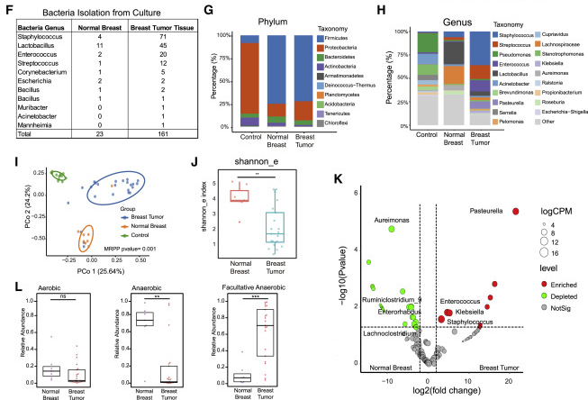 人類BT保守菌群圖譜在人類乳腺癌中,原發(fā)腫瘤和轉(zhuǎn)移部位之間的微生物群聯(lián)系尚不清楚。通過采集伴有配對腫瘤相鄰正常乳腺組織和淋巴結(jié)轉(zhuǎn)移的人BT組織,通過16S測序分析其微生物菌群組成。這些數(shù)據(jù)表明,小鼠BT和人類BT具有相似的微生物群落結(jié)構(gòu)和動態(tài),表明人類BT的微生物群可能在人類癌癥的發(fā)病和發(fā)展中發(fā)揮保守的作用。