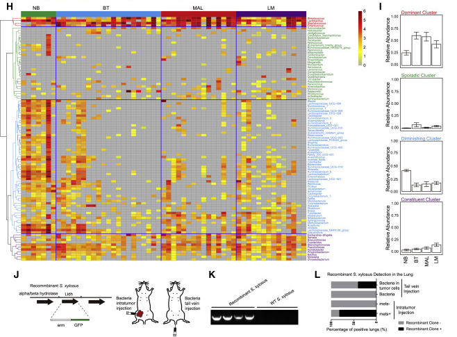 為了可視化腫瘤轉(zhuǎn)移過程中微生物群的動態(tài)變化,研究人員繪制了不同樣本中不同細菌屬的豐度,以NB、BT、MAL、LM的順序作為腫瘤進展的指示。有趣的是,無監(jiān)督聚類將細菌分為具有不同動態(tài)模式的四類(圖4H和4I)。顯性聚類增加了乳腺組織中的豐度,微轉(zhuǎn)移持續(xù),大轉(zhuǎn)移減少(圖4H和4I)。