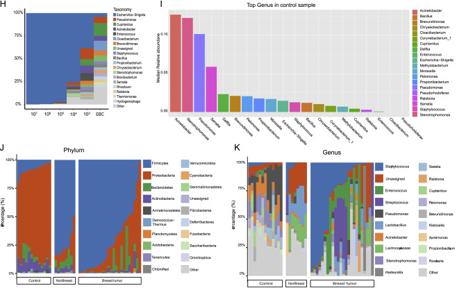 圖S1。在門和屬水平上優(yōu)化EBC對照組、正常乳腺和乳腺腫瘤組織常駐菌群分析及菌群相對豐度,與圖1和STAR方法相關(guān)