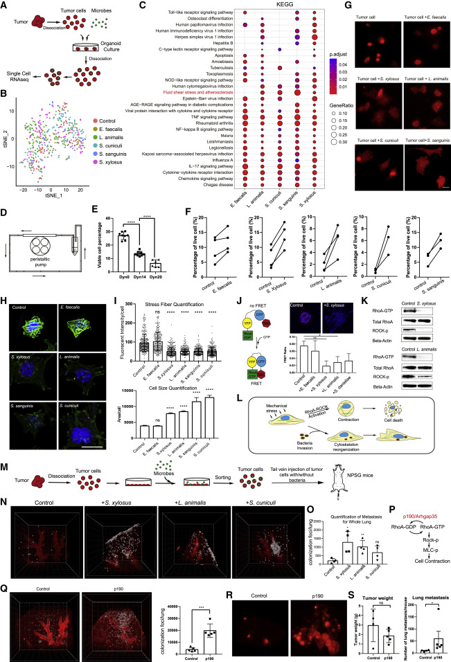 研究對從類器官培養(yǎng)中分離的細菌入侵癌細胞進行單細胞RNAseq分析(圖6A)。 KEGG通路分析顯示,被細菌入侵的腫瘤細胞開啟了許多免疫相關(guān)信號,包括toll樣受體信號通路、nod樣受體信號通路、TNF信號通路、NF-κB信號通路、Th17信號通路、細胞因子趨化因子相關(guān)通路等(圖6C)。有趣的是,研究發(fā)現(xiàn)木糖擬南芥、動物擬南芥、兔丘擬南芥和馬血擬南芥對腫瘤細胞的侵襲特異性地觸發(fā)了流體剪切應(yīng)力途徑。