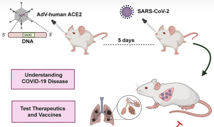 新型小鼠模型制備新冠小鼠模型除了轉(zhuǎn)基因的方式之外,還有用腺病毒載體轉(zhuǎn)導(dǎo)hACE2制備新冠模型小鼠的方法。2020年6月10日,廣州呼吸疾病國家重點實驗室趙金存教授團隊聯(lián)合多家單位共同發(fā)表了利用腺病毒載體制備的新冠小鼠模型,如下圖所示,該研究通過復(fù)制缺陷型腺病毒(Ad5-hACE2)將外源hACE2通過鼻內(nèi)轉(zhuǎn)導(dǎo)的方式遞送入C57BL/6和BALB/c兩種品系及相應(yīng)基因敲除的小鼠中,對小鼠進行攻毒實驗,通過免疫印跡和流式細胞術(shù)檢測hACE2的表達。
